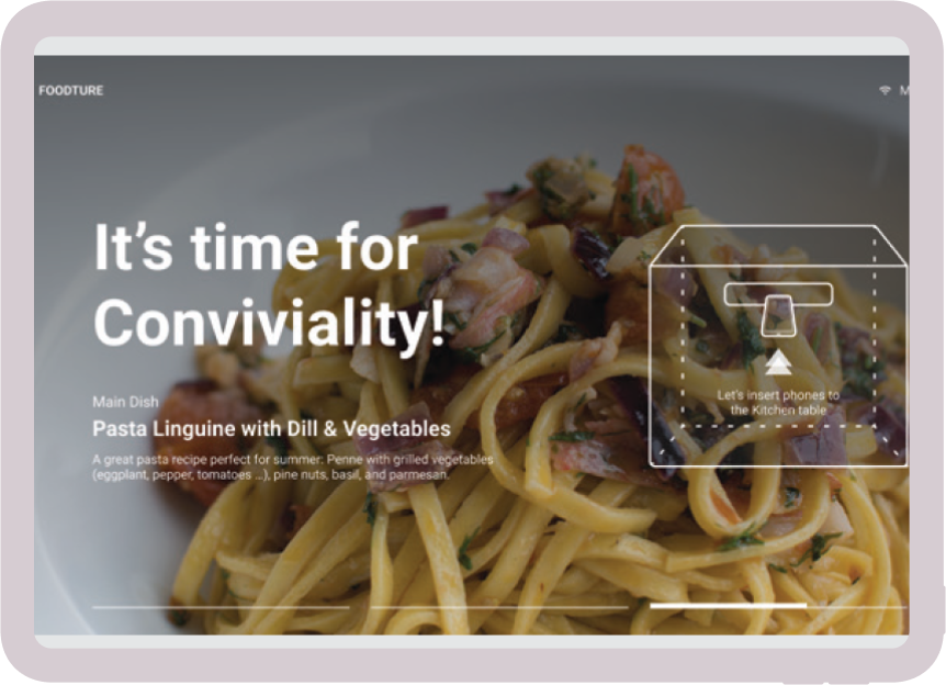 It also helps families to collaborate better via smart division of cooking tasks. After cooking, a theme composed of meals, ceiling atmosphere, music and dress code suggestions, allows the family to enjoy conviviality.